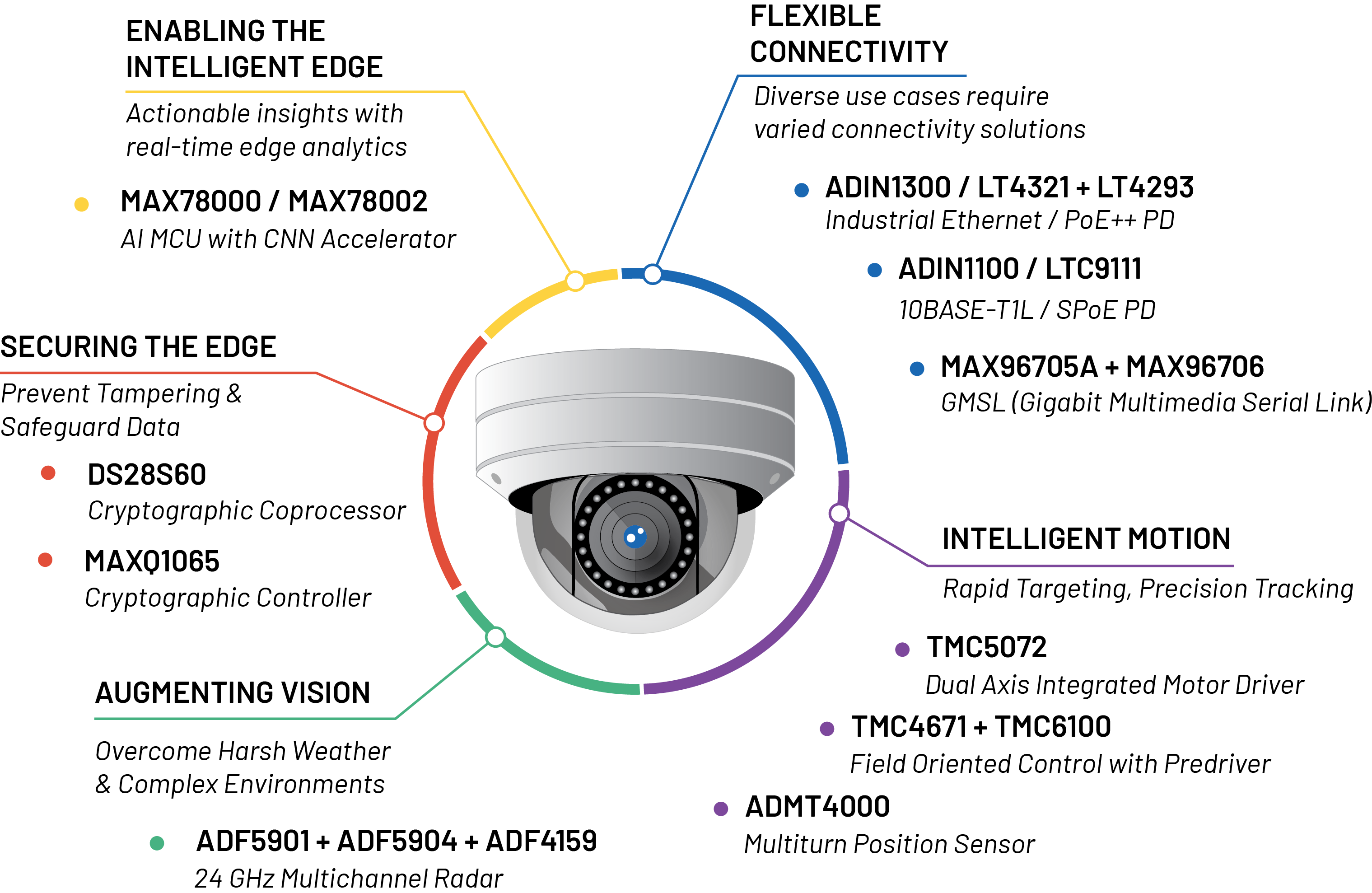 Public safety and infrastructure security is fueling the adoption of intelligent IP camera with embedded AI that can analyze and detect events or behaviors and send real time alerts to first responders. ADI brings the core technology and execution expertise to enable cameras to see, sense and think at the intelligent edge.